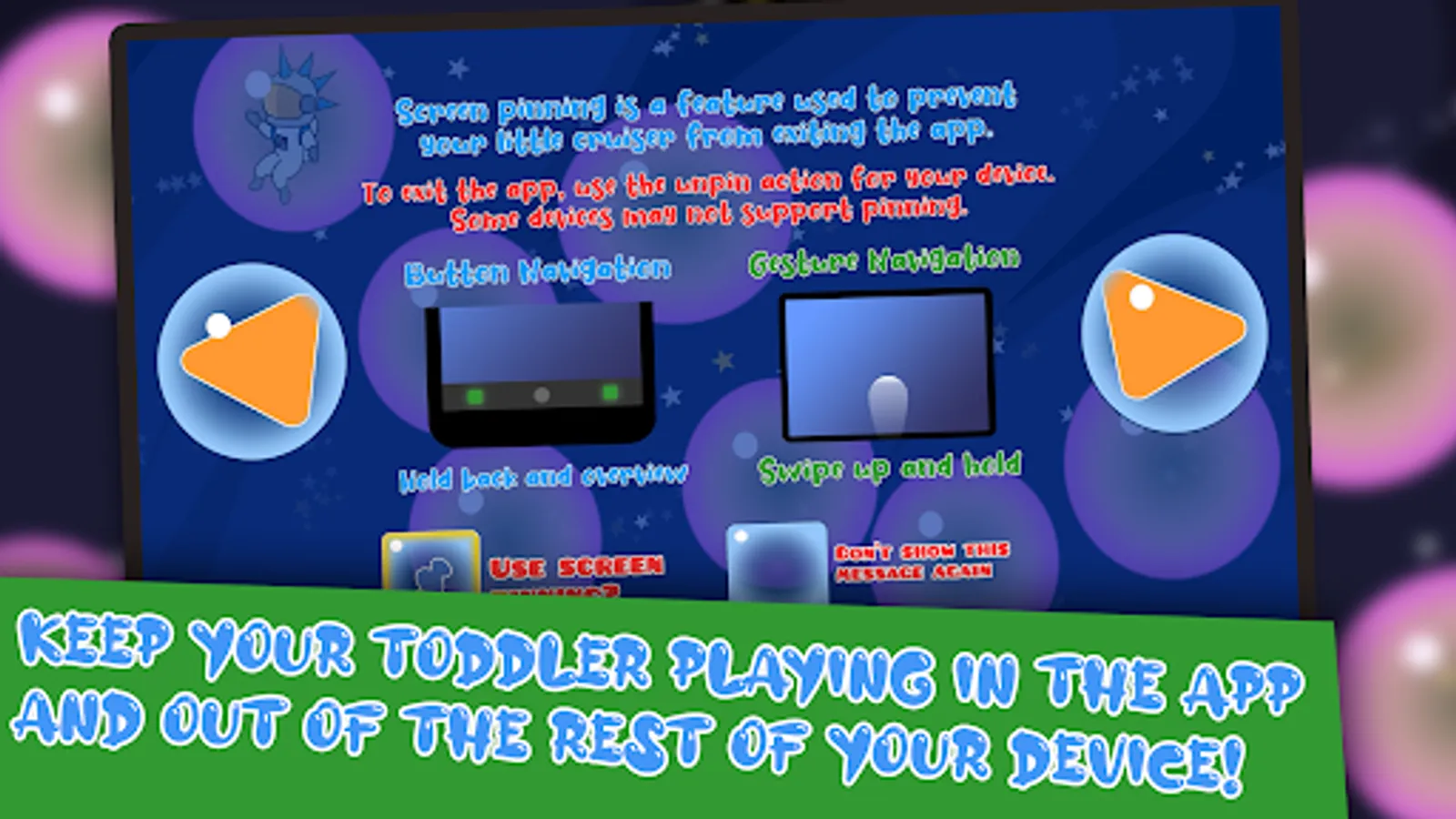 Let your little cruisers explore new sensory inputs as they tap, pop, and sprout in a digital sandbox designed just for them. First, you navigate the menus and set up the app. Then we keep your device safe as your toddlers discover the experiences hidden within.