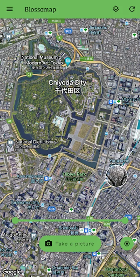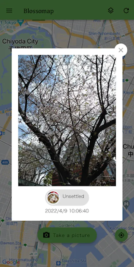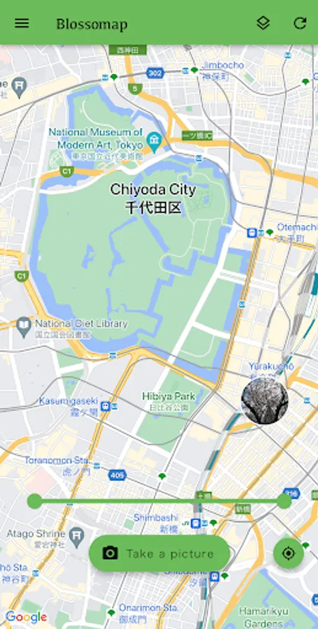 - The app displays photos of flowers taken by users of the app at the location where the photo was taken on the map.