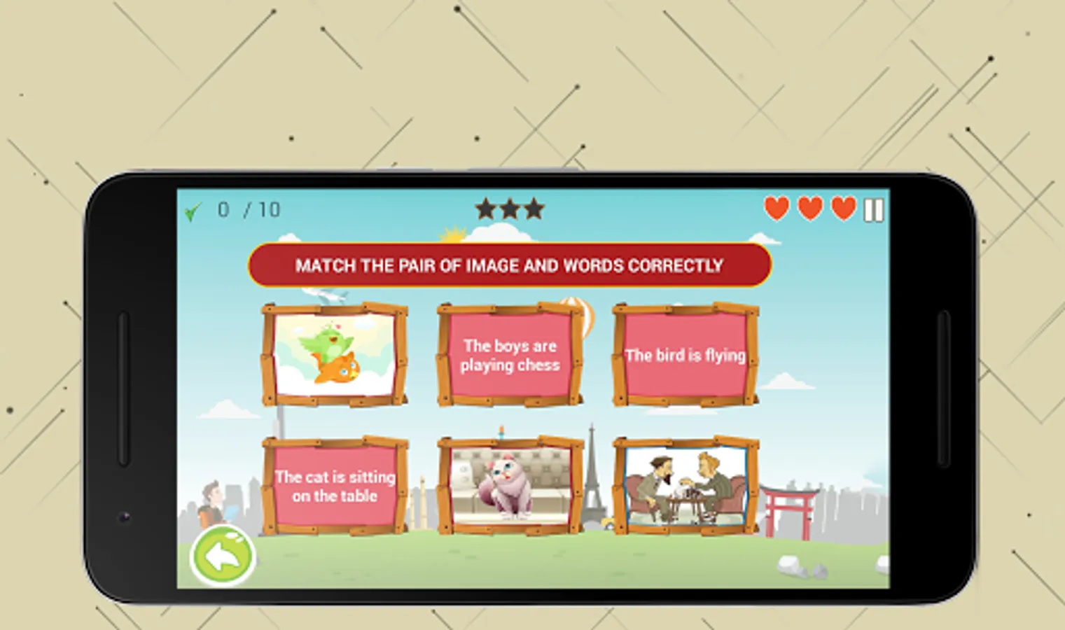 Pair image with sentence: This feature is to more enhance the efforts to read the sentence and understand its meanings. Here 3 images and 3 sentence are given in frames. Player has to tap on sentence and then tap on the correct image to match them. Then 1 by 1 the correct pairs will be removed from the screen and another activity will take place.