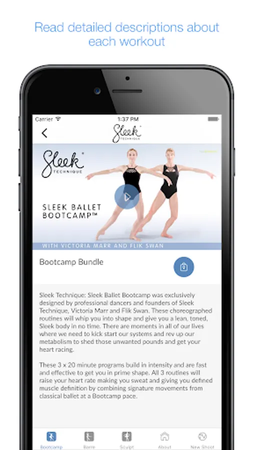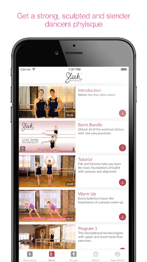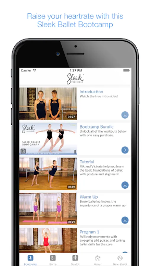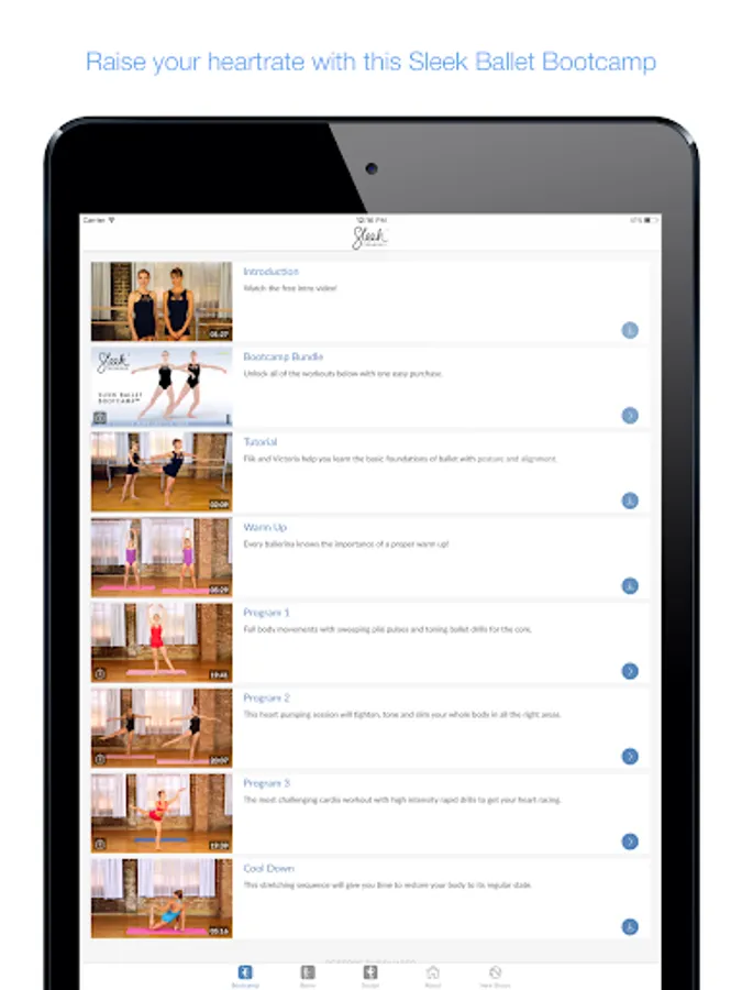 Sleek Ballet Bootcamp™: 3 x 20 minute programs that build in intensity and can be played individually or consecutively. Each Ballet Bootcamp sequence is designed to raise your heart rate and make you sweat, so you burn calories, melt off the pounds and create lean muscle mass.