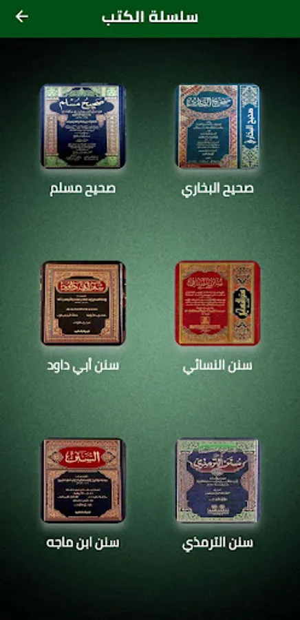 The application includes all the books of hadith Sahih al-Bukhari, Sahih Muslim, Sunan al-Nisa’i, Sunan Abi Dawood, Sunan al-Tirmidhi, Sunan Ibn Majah with an overview of each of the imams narrators.