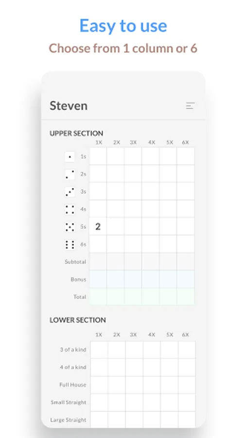 Play a game of Yahtzee with up to six columns at the same time. The first column counts one time and the sixth counts six times.