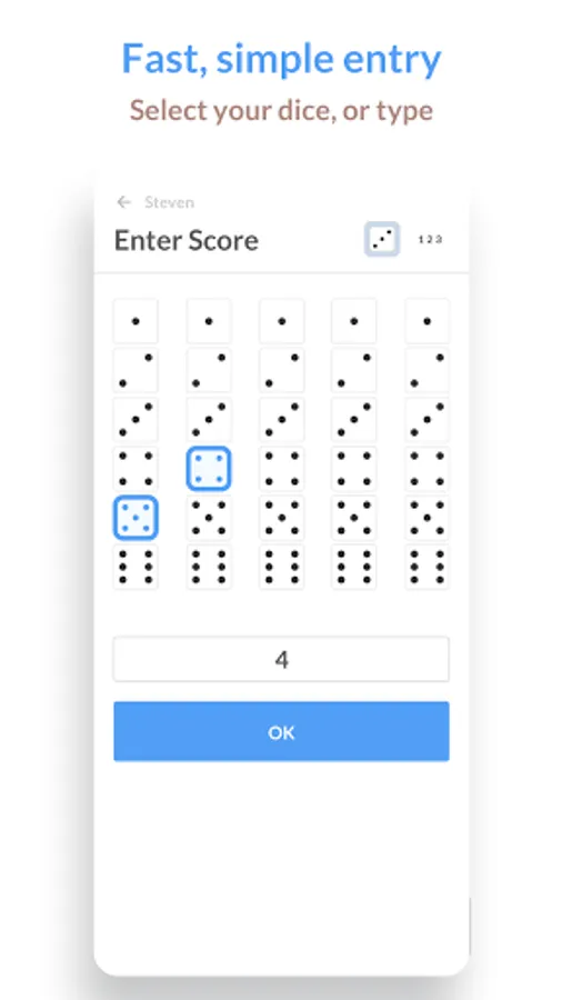 Just like you would normally play with Yahtzee you throw real dices, but instead of using pen and paper, you now select a field in the app. The field will come to the front and you can select the result. Press "Save" and the corresponding score is entered in the field.