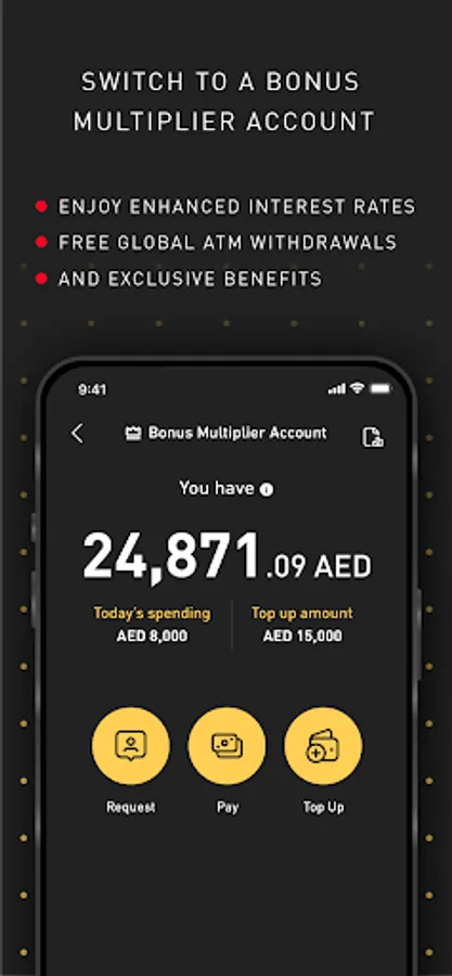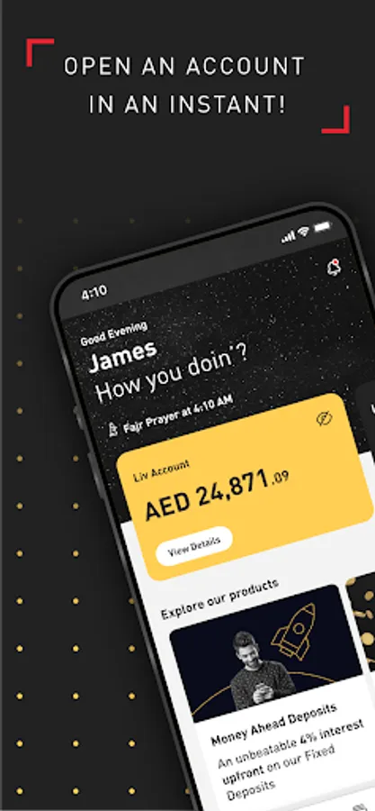• Open an account in an instant from the app with just your Emirates ID and passport. It’s as simple as that.