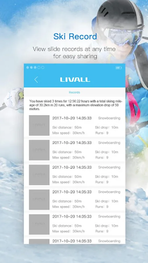 Record your ski real-time data, including the max slope/ drop/ max speed/ average speed/ current altitude/runs of trips and other data, share skiing record with your friends.