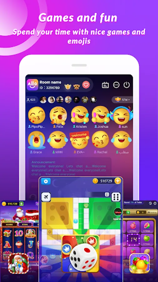 Allo not only provides a platform for users to make friends and chat, but also provides very popular fun games, such as Ludo, UMO, Domino, Fruit party,Horse racing, Camel and so on. You can chat with your friends while playing games anytime, anywhere, Allo will bring you a new experience of ease and pleasure.