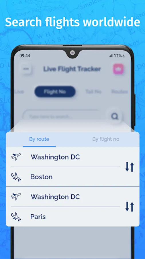 Route search in flight tracker app will provide flights data like delay status and also show live map.