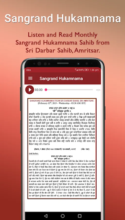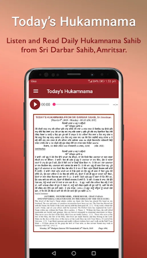 Along with live kirtan you can listen and read hukamnama sahib from sri harmandir sahib and hukamnama katha (mukhwak & mukhwak katha) which will updated on daily basis. Also, Monthly Sangrand Hukamnama Sahib you can listen direct from darbar sahib.