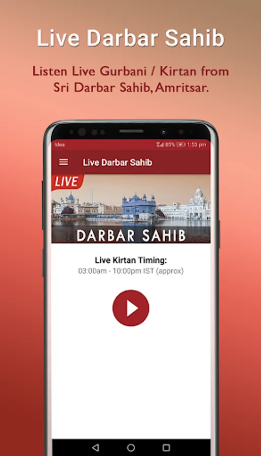 This App has live radio from Sri Harmandir Sahib, Sri Darbar Sahib (Golden Temple). Daily Hukamnama with lyrics, harmandir sahib kirtan, kirtan darbar sahib, gurbani kirtan duties of Hazuri Ragi names with date and time. You can also listen Golden Temple morning prayer and aarti everyday. Kirtan from golden temple is very famous kirtan worldwide, Live Kirtan Harmandir Sahib, live kirtan from darbar sahib.