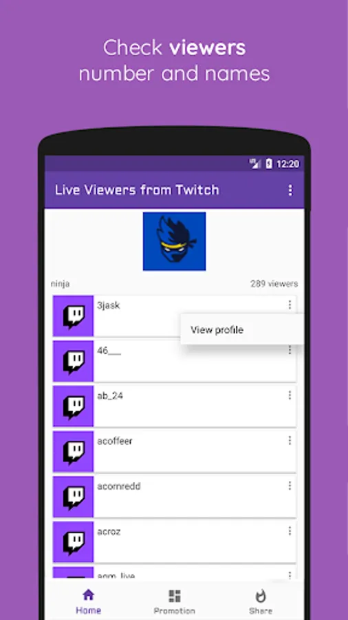 View live viewers number and usernames of a twitch account name.