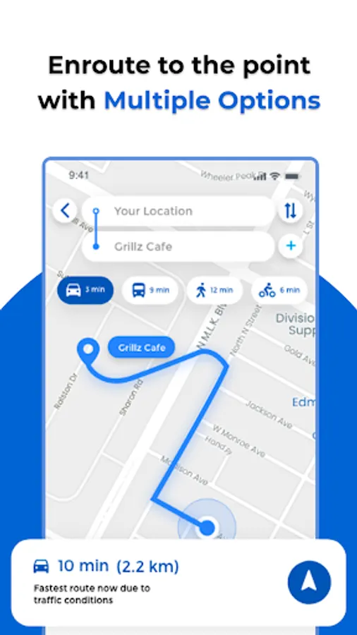 While using our traffic app, it offers voice navigation and start with the following directions route maps in this walking directions app for driving directions maps. Install our GPS App which offers navigation live traffic and turn by turn navigation in GPS maps apps.