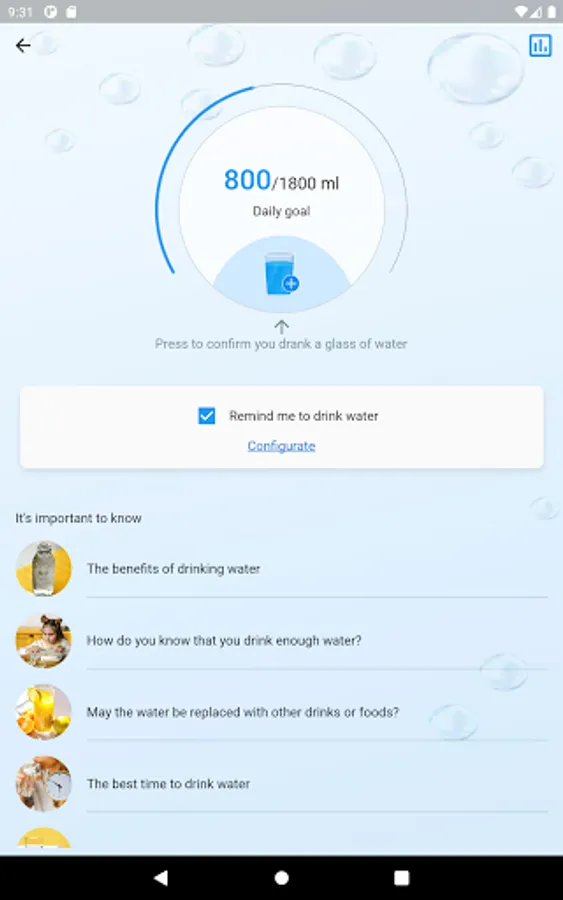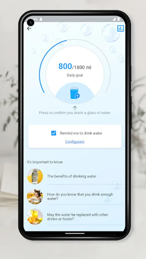 Also with this app you can find out your norm of daily water intake and track your daily water drinking, which is very important for maintaining vitality and health. Water improves skin elasticity and slows down aging. To achieve the maximum effect, you need to observe the drinking regime during the day and we’ll help you with this in the "Water Control" section.