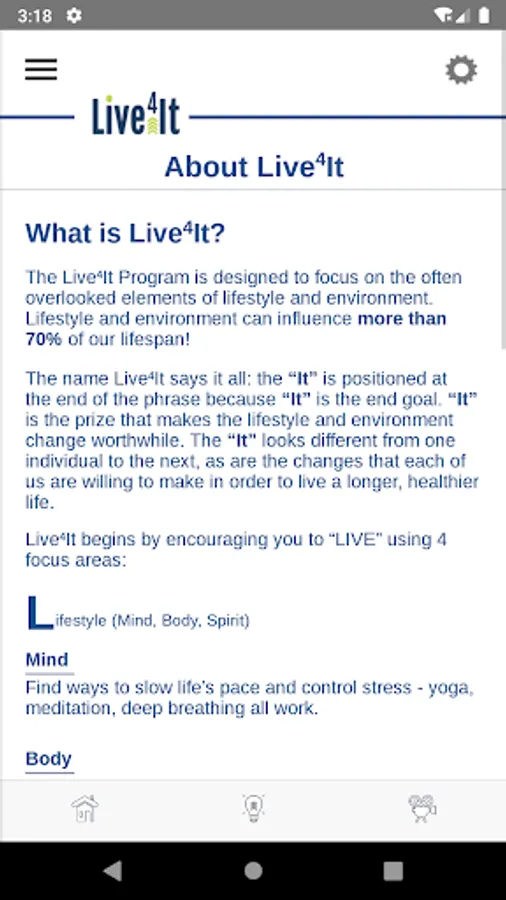 Live4It offers a unique health and wellness journey by creating one goal and one message to provide opportunities to identify what is important to you (your “It”), participate in Expeditions, share recipes, attend social events, and engage in mental health tools . Live4It to live a longer, healthier life ...Your Health. Your Journey. Your "It".