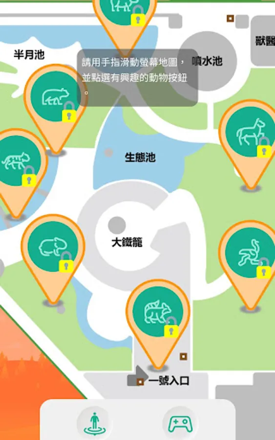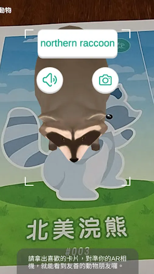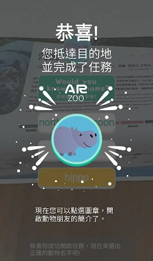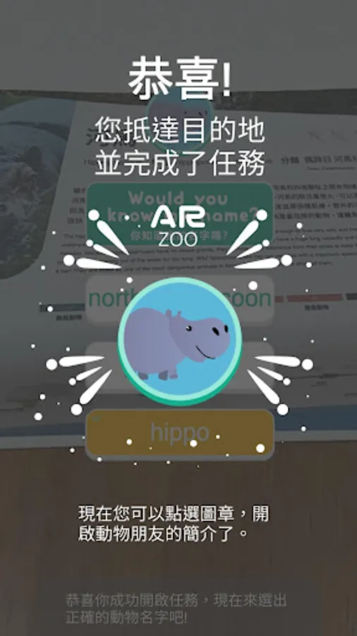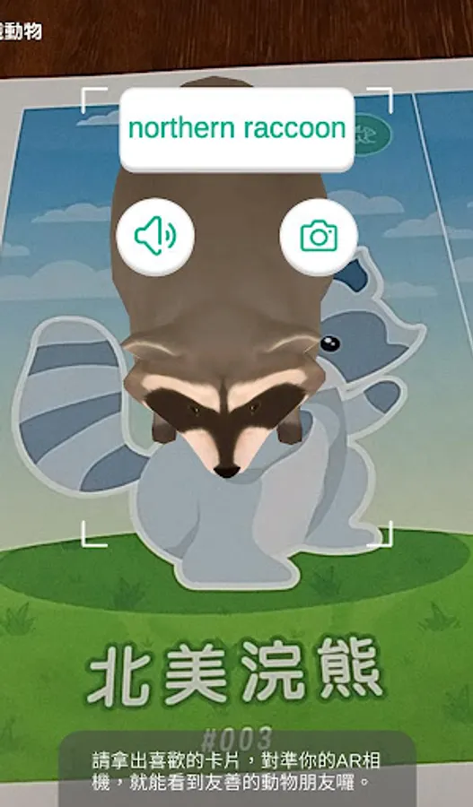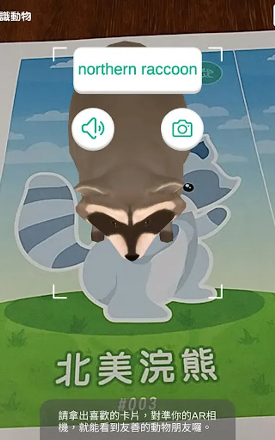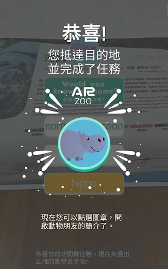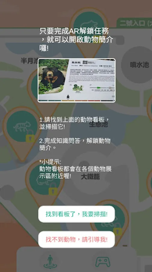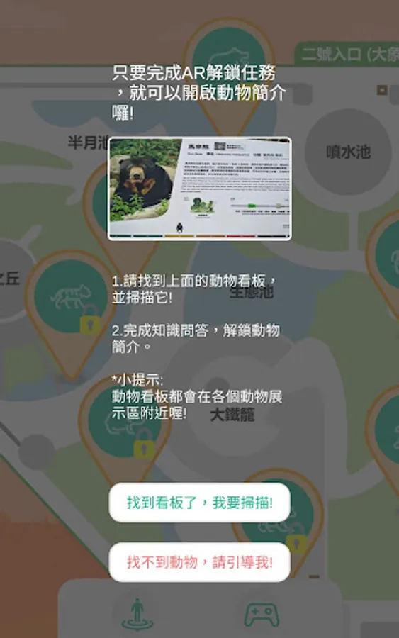 LiveAR Zoo APP,包含【AR導航】【AR互動】兩大部分。【AR導航】提供使用者根據顯示的3D動物導航指引,引導使用者前往該動物在新竹動物園的所在地區,抵達目的地後,只要依照指示完成任務即可獲得動物徽章及動物簡介。【AR互動】則是使用者可先藉由AR辨識掃描活動圖卡,認識各個動物的外型和英文名字後,即可切換至測驗關卡進行挑戰。