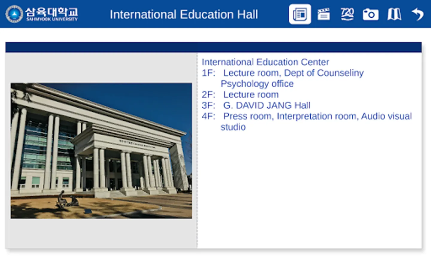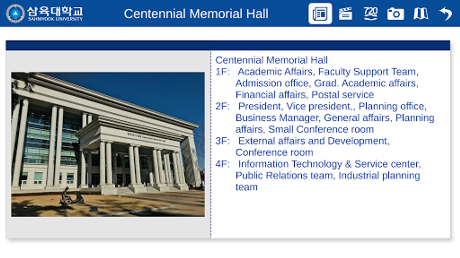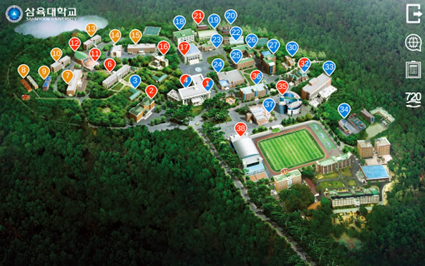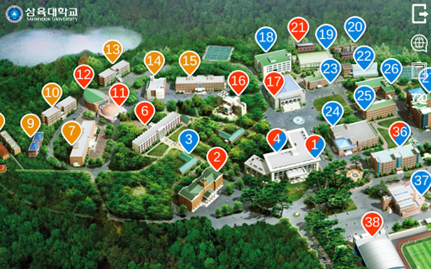 AR Tour App offering freshmen and visitors to get to know the campus, supports by Korean, English, Chinese and Vietnamese languages. There are 34 main buildings in the campus, and are divided into three categories by functions: education, administration and living.