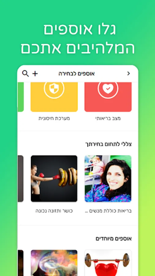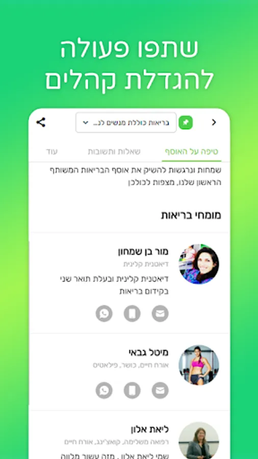 היחשפו לאלפי לקוחות פוטנציאלים שהבריאות חשובה להם, בנו את עצמכם כמומחים, ומכרו את המוצרים והשירותים שלכם ישירות מהאפליקציה. כמו כן, ליבאטיפ מאפשרת לכם ליצור אוספים משותפים עם מומחי בריאות אחרים - ובכך להיחשף לקהלים נוספים.