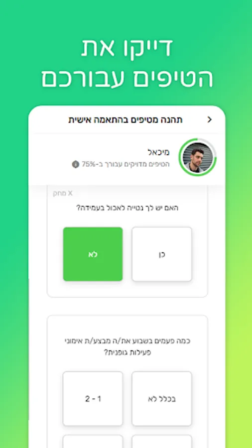 אנחנו לא נציף אתכם בתוכן לא רלוונטי. פיתחנו אלגוריתם שיודע לשלוח לכם רק את הטיפים שרלוונטים למצב הבריאותי ולמטרות שלכם, ורק בזמן הנכון.