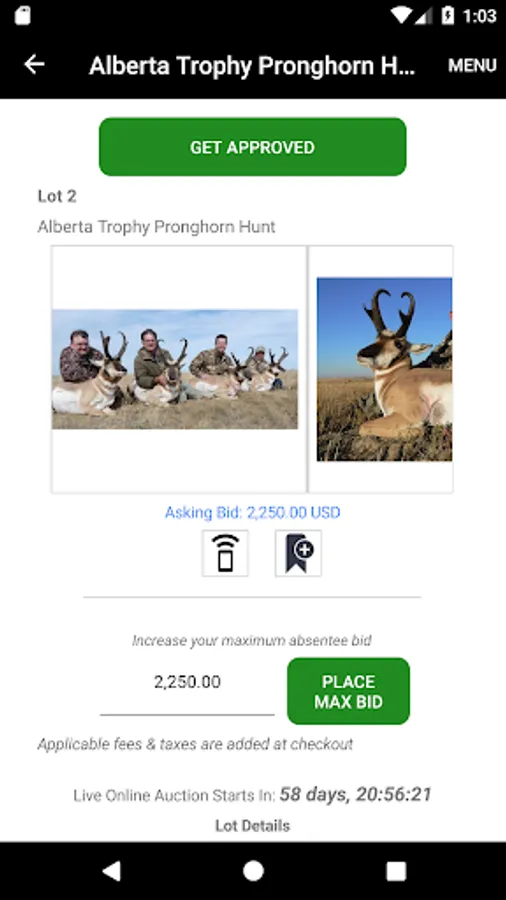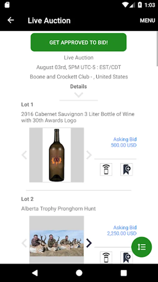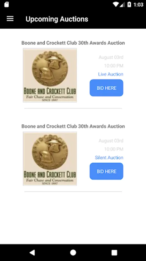 User friendly auction bidding app that connects the bidder to the auction using real time audio/video. Connect with Chapter and Hunting Conservation Events, get notified when items you are interested in are up for auction and never miss an opportunity to bid no matter where you are.