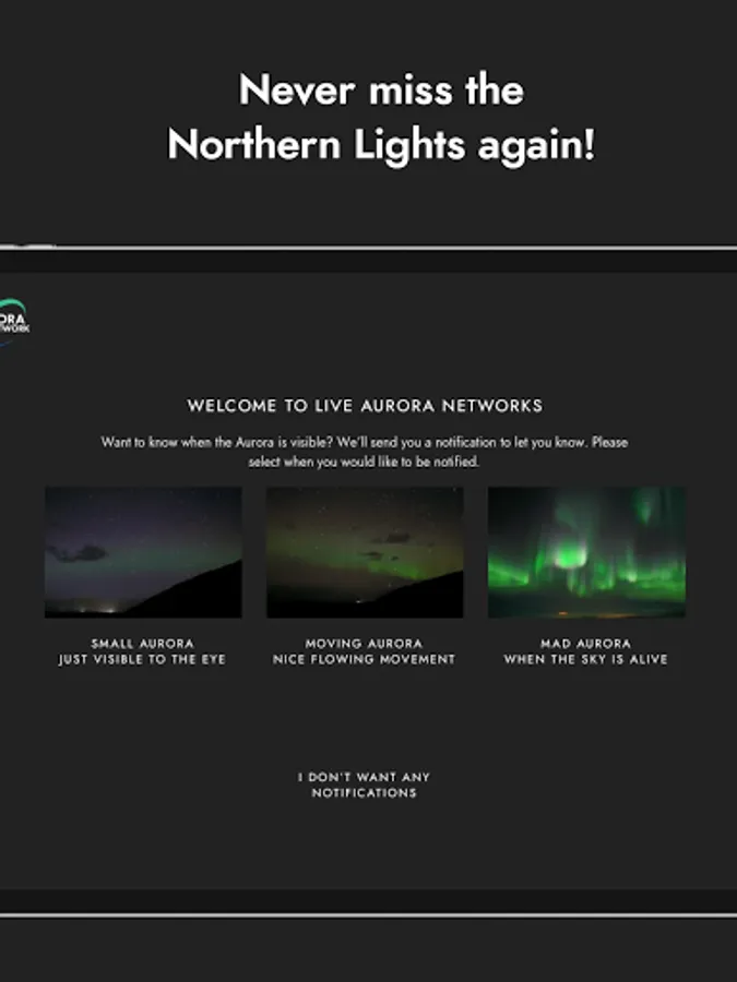 Live Aurora Network pushes out alerts in real time, thanks to software designed to detect the colours of the Aurora, while grading the density and percentage of the sky that is showing the lights. This is especially helpful to find breaks in the clouds!