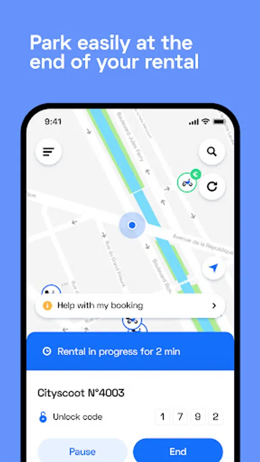 - Park in an authorised location (free for our electric scooters!) and end the rental