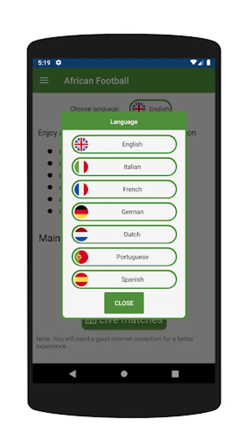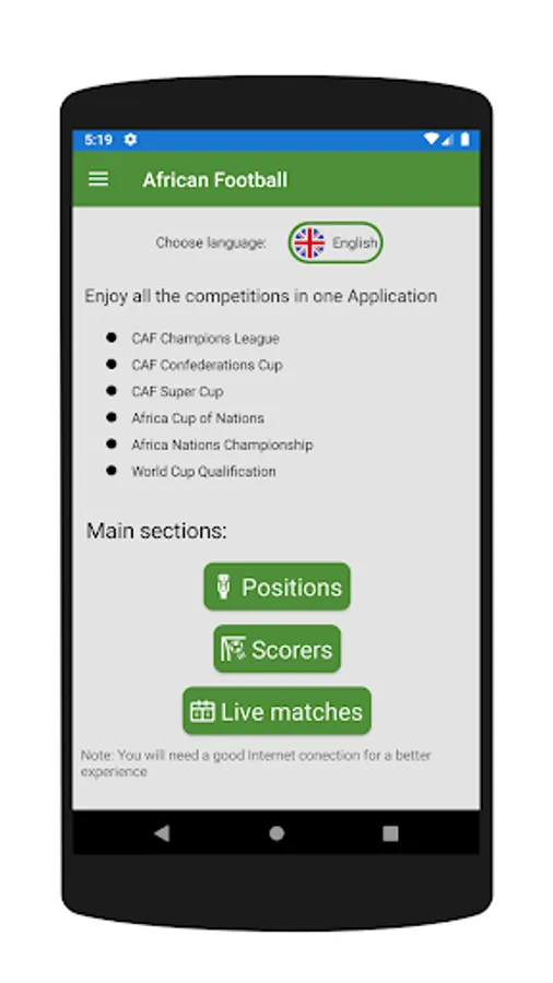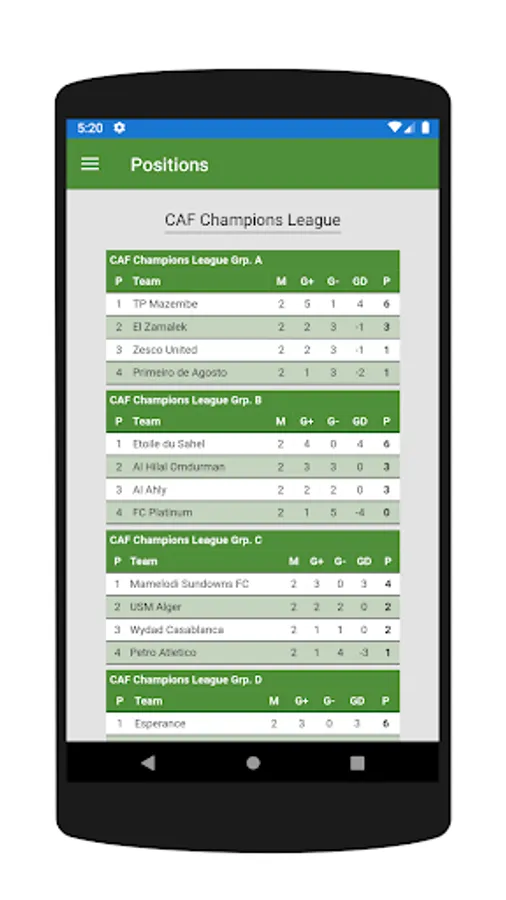 This application of African football will allow you to follow live all the matches of the most relevant competitions. You can follow the international football matches of Africa at club and country level. In addition, all relevant information is provided to the competition: positions, results, fixture, scorers and more.