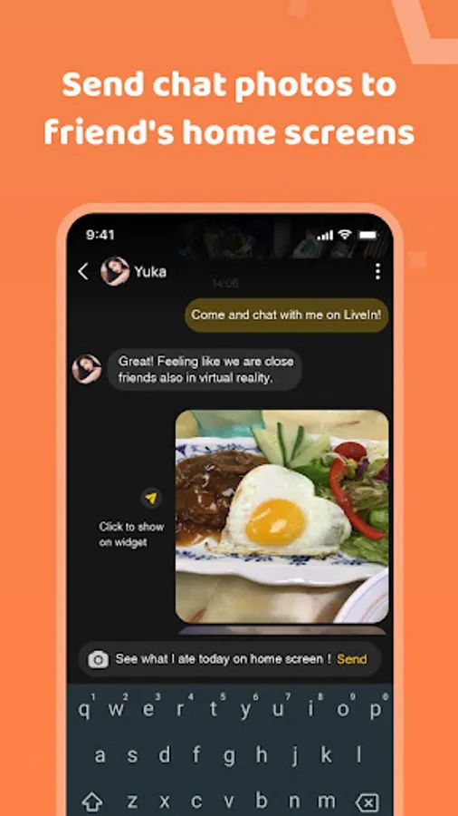 The idea of LiveIn is super simple: Add LiveIn on your Home Screen as a widget. When you send a photo (either by taking a live photo from LiveIn cam, or upload from camera roll) to your friends, the photo will automatically pop up on the Home Screen! To make it more fun,you can also draw or write on your photo!
