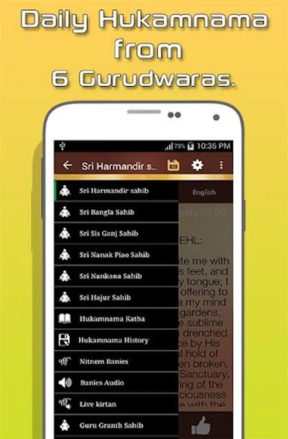 An App to all Sikh followers. Sikh Hukamnama gives you all 6 Gurdwara Daily Hukamnama at one place in detail explanations in Punjabi and English, You can listen hukamnama Audio and Hukamnama Katha Audio too. Features like Read Nitnem in Punjabi, Hindi and English, listen Nitnem banis, Guru Granth Sahib Ji (hindi and Punjabi), Live Darbar Sahib Kirtan and Online Sikh Books. No need to download Japji sahib or each bani separately now.