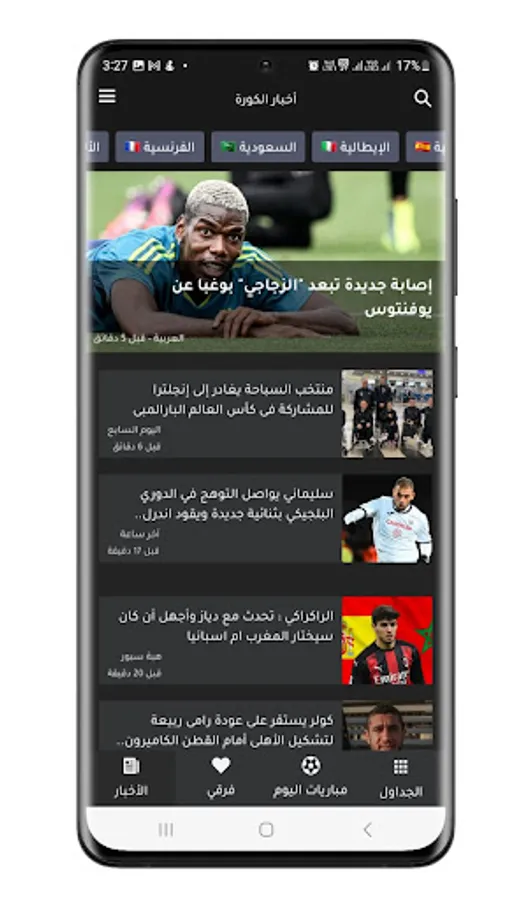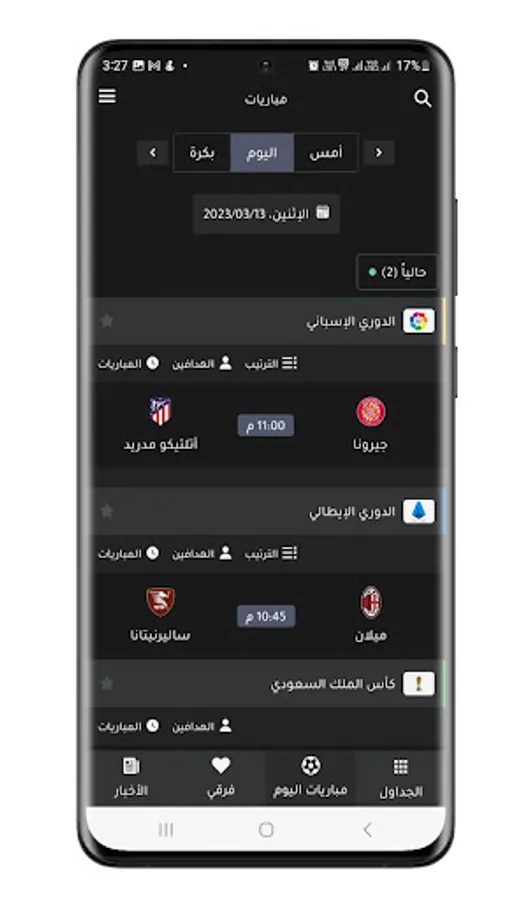 The application displays real-time football matches.