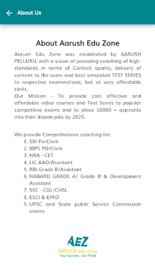 Aarush Edu Zone was established by AARUSH PELLURU, with a vision of providing coaching of high standards in terms of Content quality, delivery of content to the users and best simulated TEST SERIES to respective examinations, but at very affordable costs.