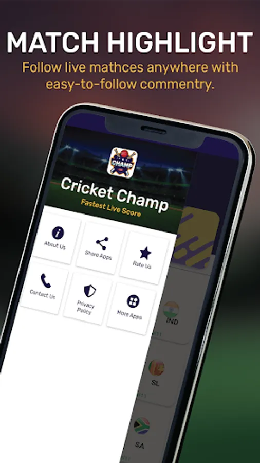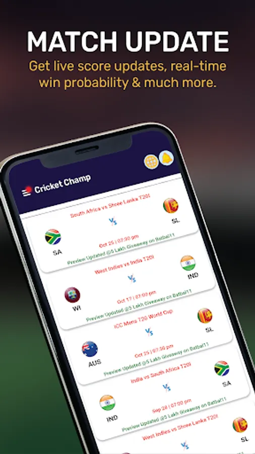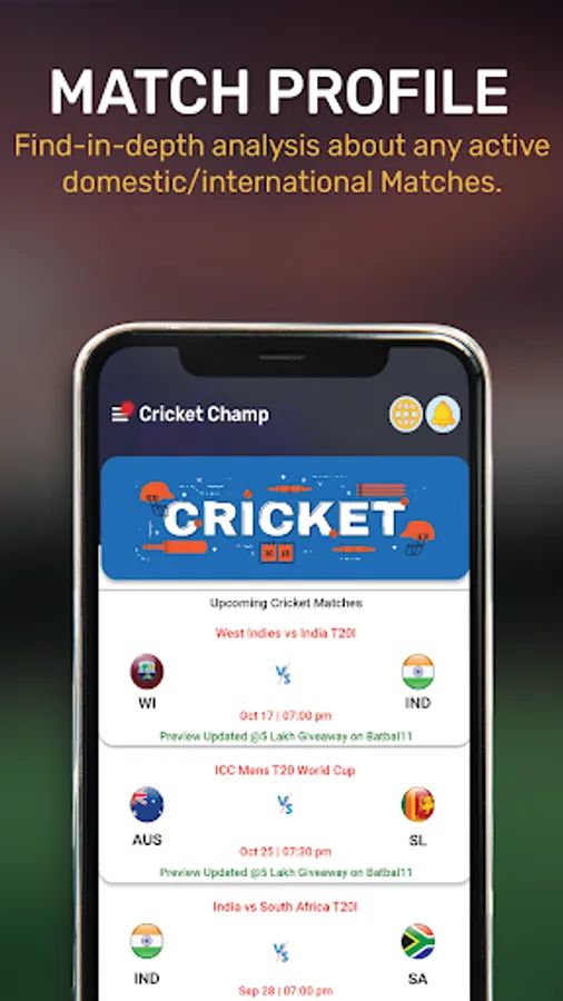 The Cricket Champ App for Lightning Fast Live IPL Match Score, ICC T20 World Cup, All International Cricket Matches, County Championship and Ranking, Cricket Live Line, Live Score, Live Cricket Match, News, Schedule & Fixtures with Details of Venues and Players.