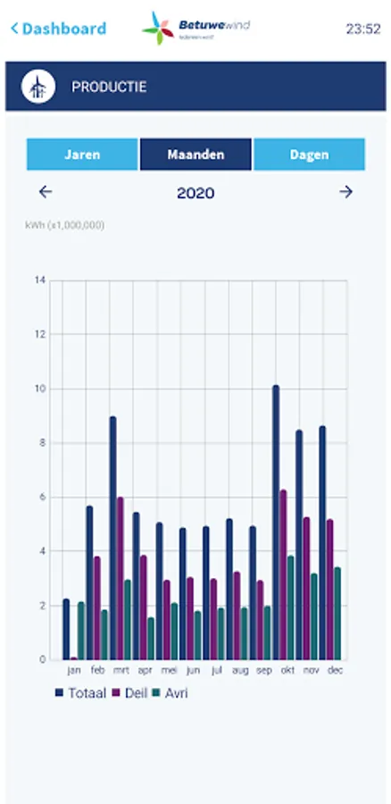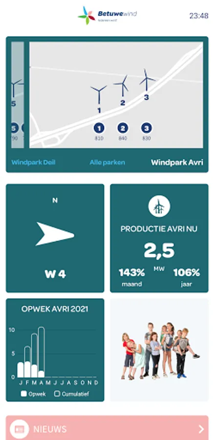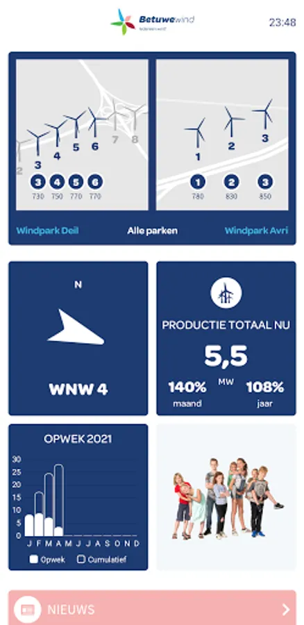 With this app you can follow the energy yield of the Betuwewind windmills. Both the current and historical yield and what contribution that makes to the total energy demand of West Betuwe. Curious why a mill is standing still? You will also find that in this app.