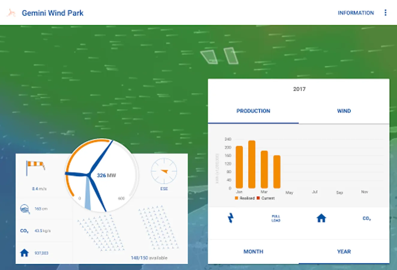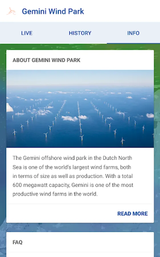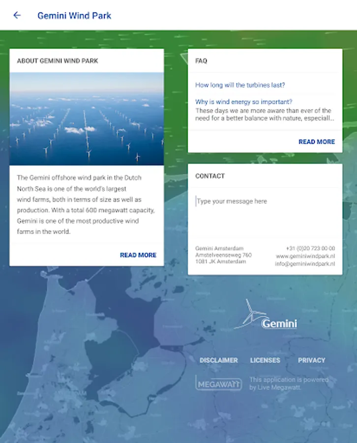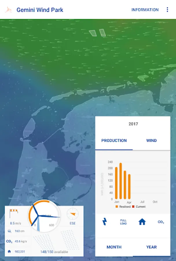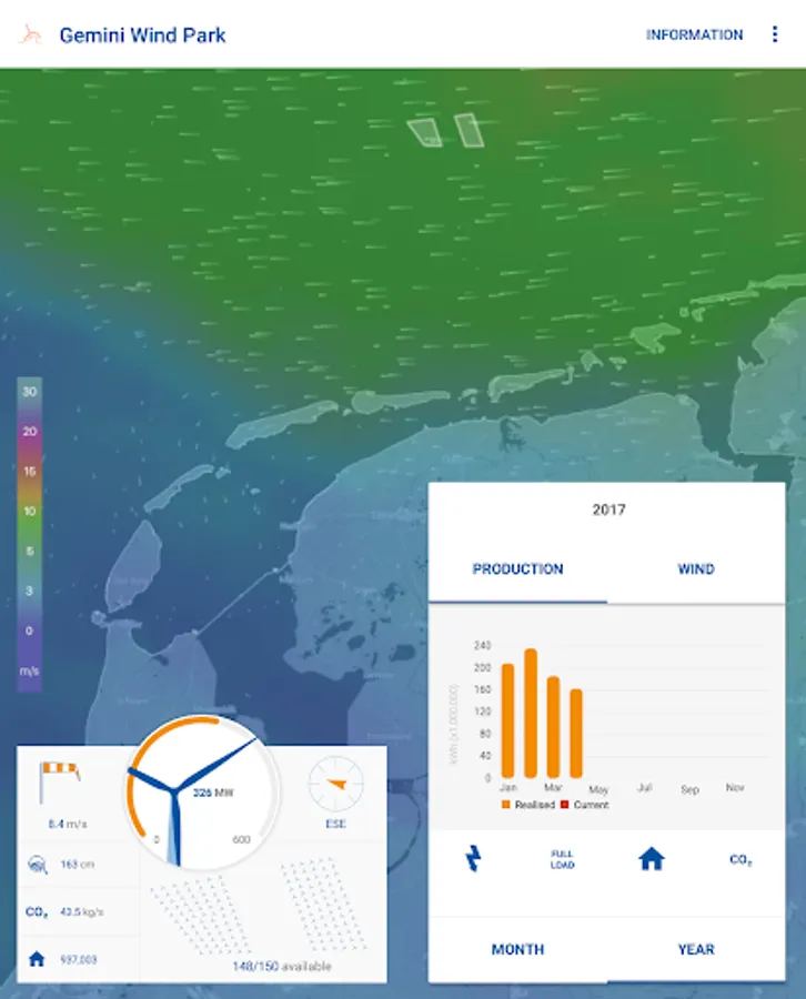 The Gemini Wind Park application allows you to view live production data and meteorological information of one of the world’s largest wind farms, located in the Dutch North Sea. Discover the actual and historical wind conditions and energy production of Gemini Wind Park and find information and frequently asked questions.