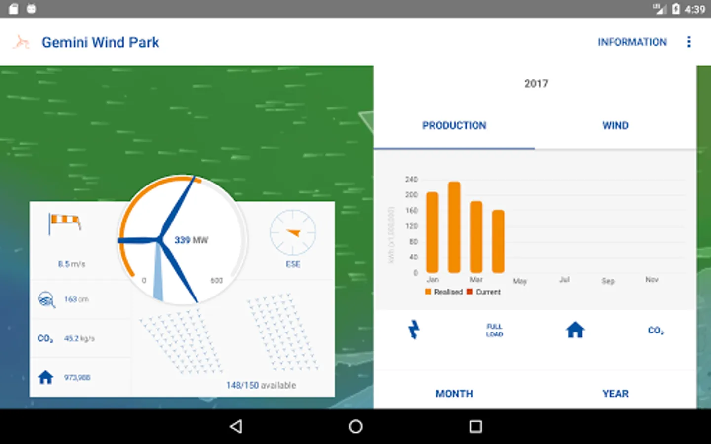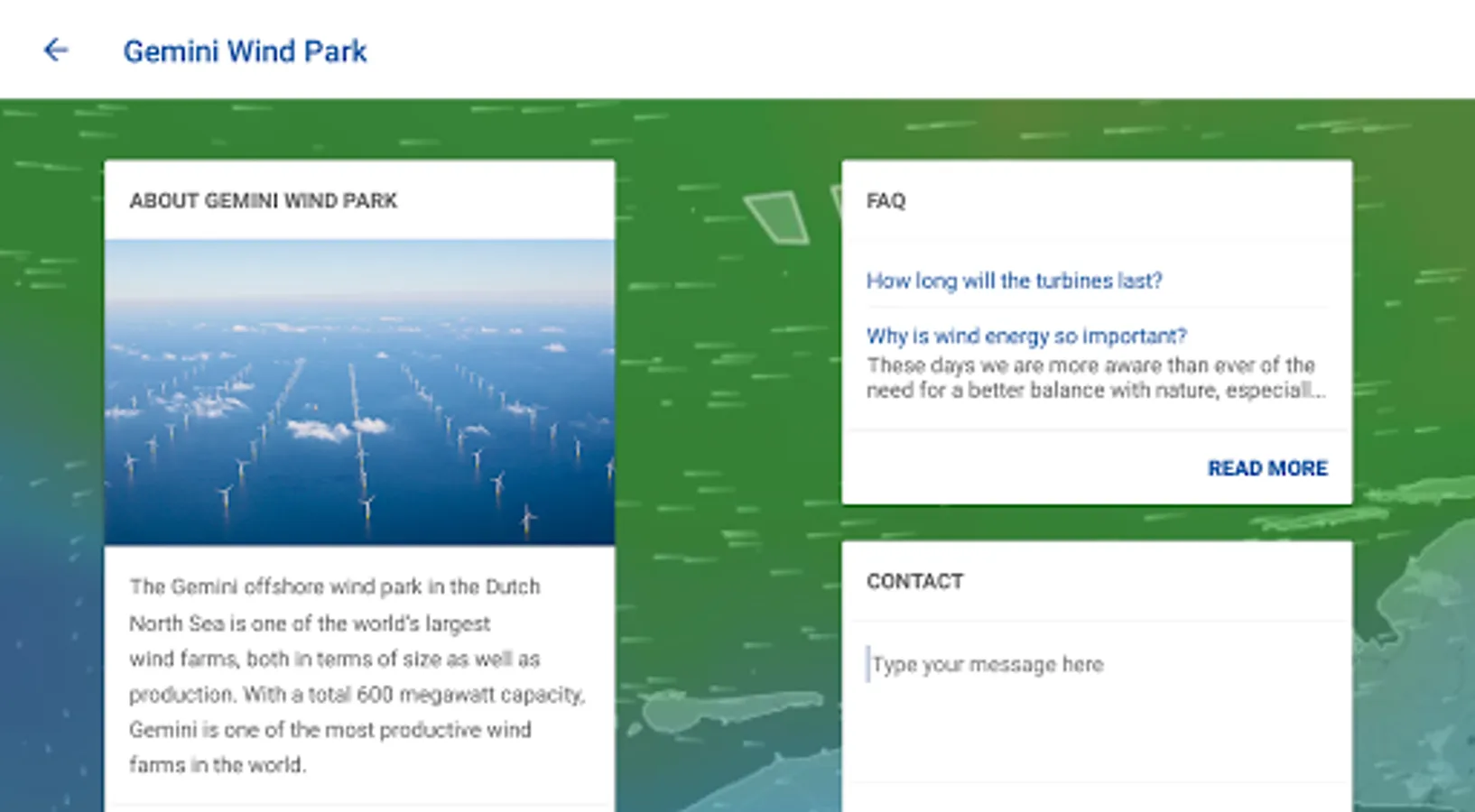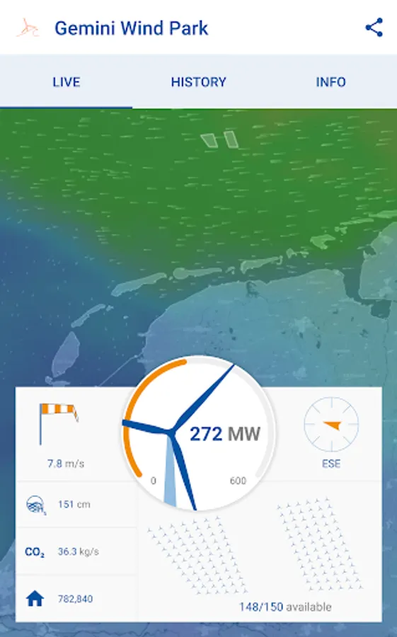 The Gemini Wind Park application allows you to view live production data and meteorological information of one of the world’s largest wind farms, located in the Dutch North Sea. Discover the actual and historical wind conditions and energy production of Gemini Wind Park and find information and frequently asked questions.