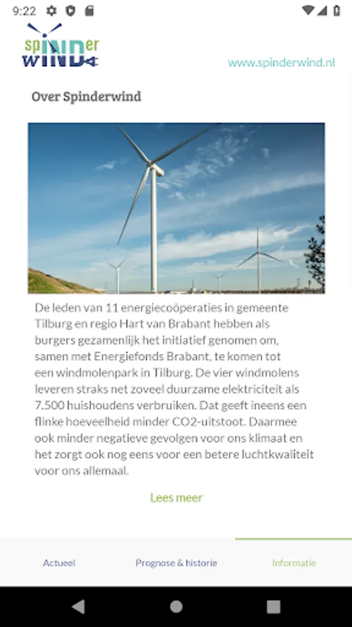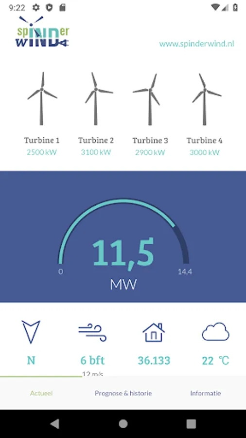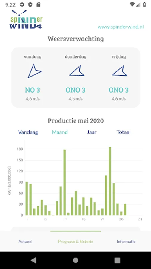 The Spinderwind app shows the current electricity production, status and weather conditions of the wind farm. You can also view the historical production from yesterday or the previous month, and read the latest news about Burgerwindpark De Spinder.