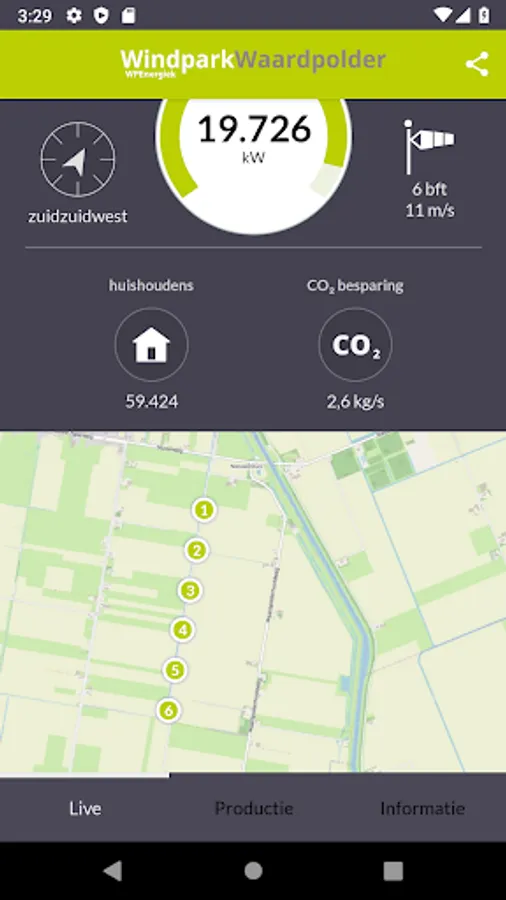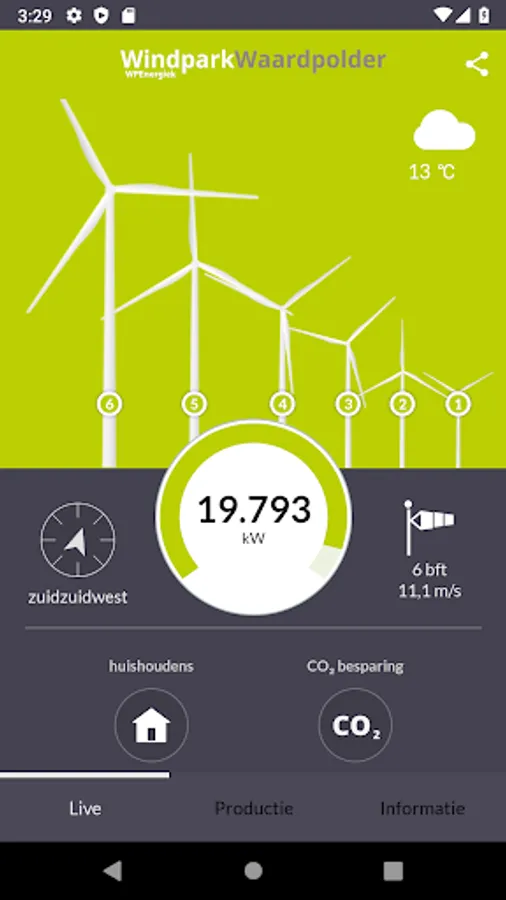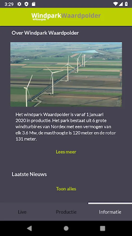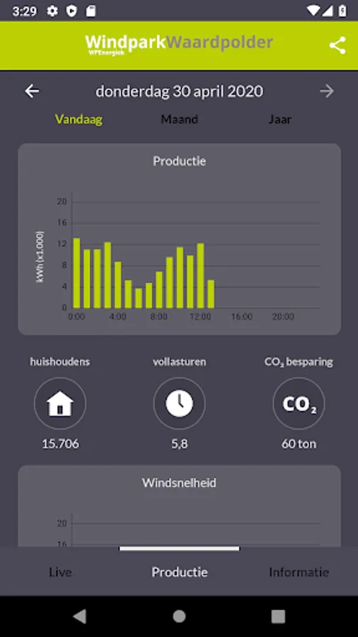 The Windpark Waardpolder app shows the current electricity production, status and weather conditions of the wind farm. You can also view the historical production and wind speeds of, for example, yesterday or the previous month.