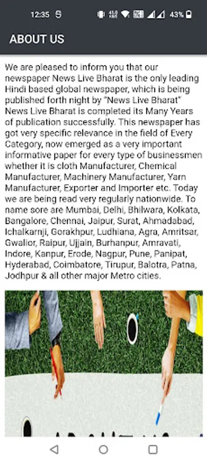 We are pleased to inform you that our newspaper News Live Bharat is the only leading Hindi based global newspaper, which is being published forth night by “News Live Bharat” News Live Bharat is completed its Many Years of publication successfully. This newspaper has got very specific relevance in the field of Every Category, now emerged as a very important informative paper for every type of businessmen whether it is cloth Manufacturer, Chemical Manufacturer, Machinery Manufacturer, Yarn Manufacturer, Exporter and Importer etc. Today we are being read very regularly nationwide. To name sore are Mumbai, Delhi, Bhilwara, Kolkata, Bangalore, Chennai, Jaipur, Surat, Ahmadabad, Ichalkarnji, Gorakhpur, Ludhiana, Agra, Amritsar, Gwalior, Raipur, Ujjain, Burhanpur, Amravati, Indore, Kanpur, Erode, Nagpur, Pune, Panipat, Hyderabad, Coimbatore, Tirupur, Balotra, Patna, Jodhpur & all other major Metro cities.
