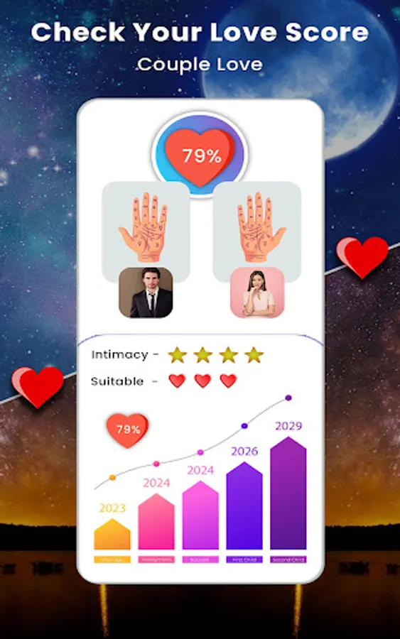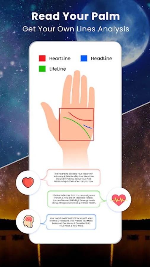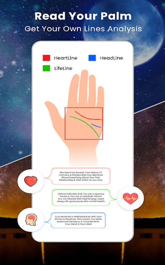 If you believe in hand reading, our app reads the palm lines according to tradition interprets the 3 main hand lines without needing to know the horoscope or zodiac sign.
