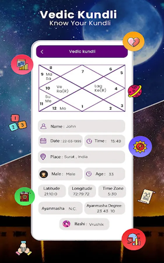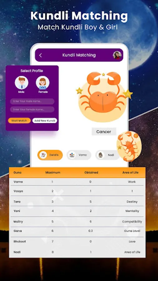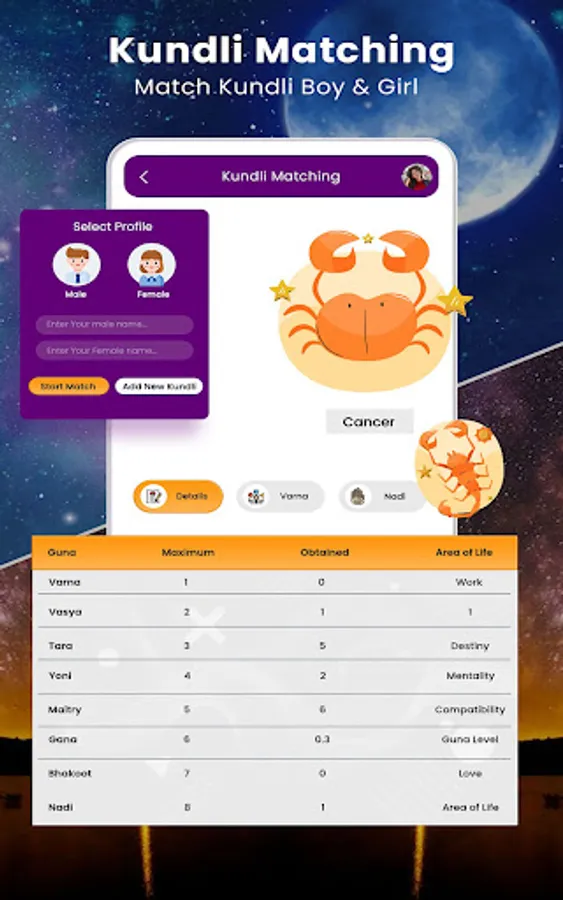 ♦ Kundli: Kundli or Vedic Kundli Matching is generated according to the positions of the constellations on the basis of the person’s birthday, time and place. Kundli created on the basis of Vedic Astrology covering panchang, planetary positions, astrological charts, upgraha, special lagna, gemstones, major vimshottari dashas.