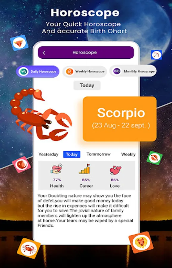 ♦ Horoscope & Astrology: Never step out unprepared with our comprehensive daily horoscope that shows astrology predictions for zodiac signs. The app covers all horoscope zodiac signs (rashi): Aries, Taurus, Gemini, Cancer, Leo, Virgo, Libra, Scorpio, Sagittarius, Capricorn.