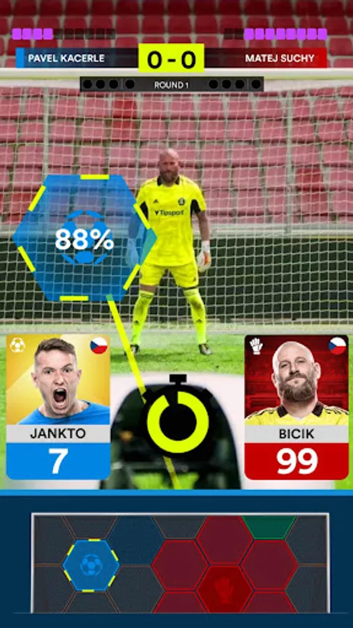 Engage in exciting penalty shootouts with friends or players globally. Utilize your top-tier goalkeeper and striker cards, outplay your opponent's best athletes, and celebrate your victory. Experience real-time soccer gaming at its finest!