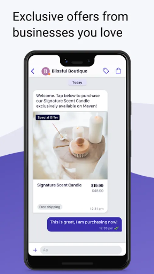 With Maven's help, making purchase decisions is as easy as chatting with a friend! Complete a purchase without ever leaving the conversation. Connect with a business to redeem your exclusive offer or browse their catalog.