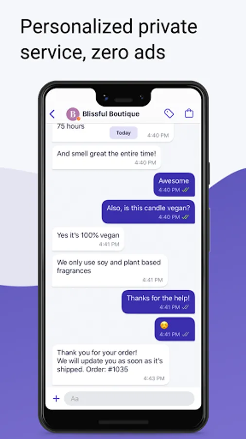 Easily message directly with businesses. Ask questions about products, get automated shipping updates, and personalized recommendations.