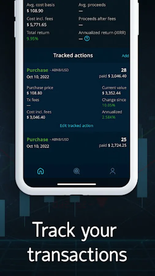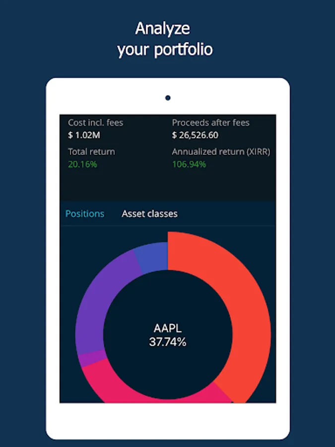 In addition to stock market charts, LiveQuote has also curated a pie chart to help you better understand the performance of your holdings. The stock tracker analyzes your portfolio and gives you valuable insights like the total return percentage, annualized return, cost, & total proceeds after fee reduction.