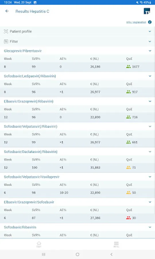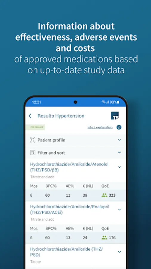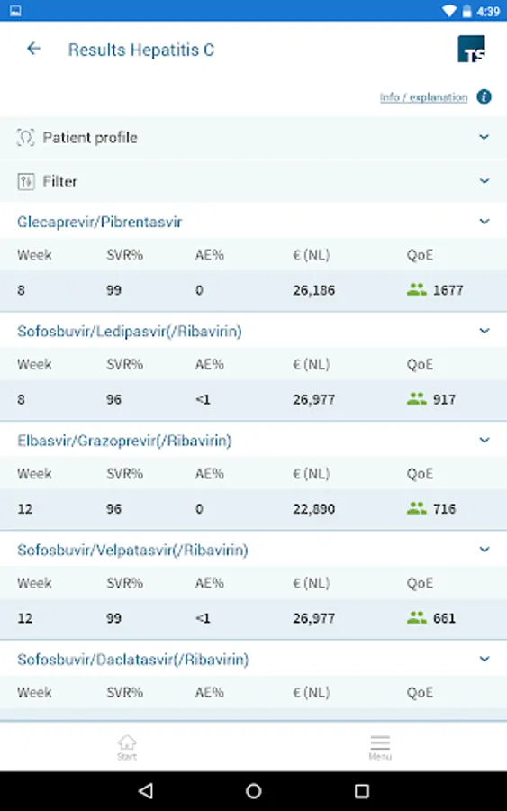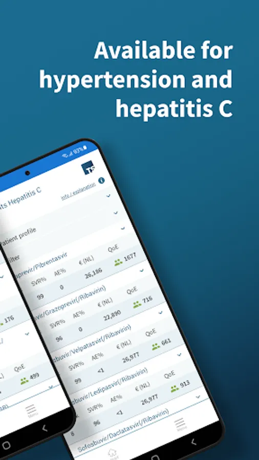 The app shows in a single glance information about the effectiveness of medication based on the disease remission (systolic blood pressure of < 140 mm Hg for hypertension and viral clearance in hepatitis C), the likelihood of adverse events, cost and patient group size. This overview allows you to easily and quickly decide on the best personalized treatment method for your patient, based on up-to-date study data.