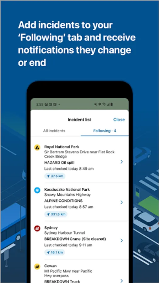 - Incident information for Sydney and Regional NSW including crashes, breakdowns, fires, floods, snow, public events and roadworks.