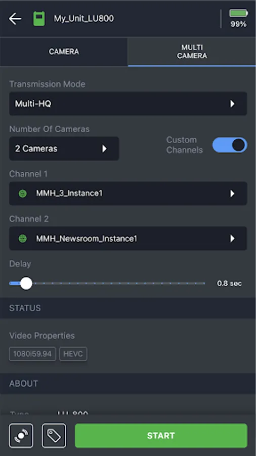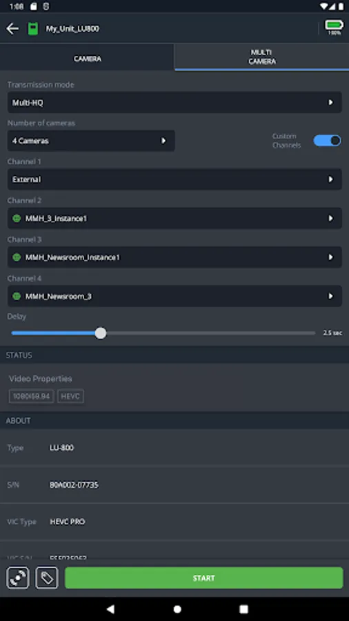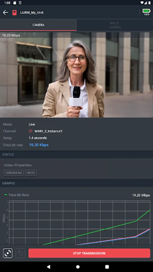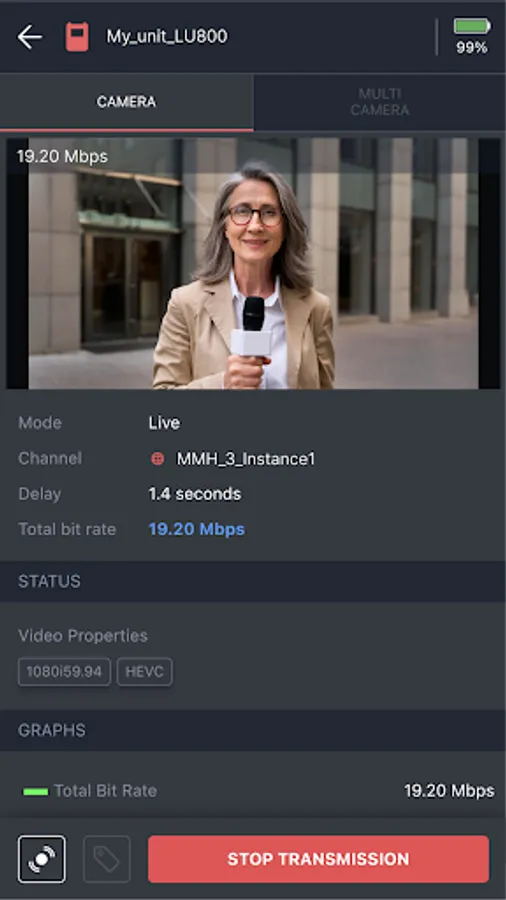 Configure the unit’s parameters, control connectivity, add metadata, and start the transmission. You can also monitor ongoing transmissions by previewing the video feeds and even view network performance through the bit rate graphs.