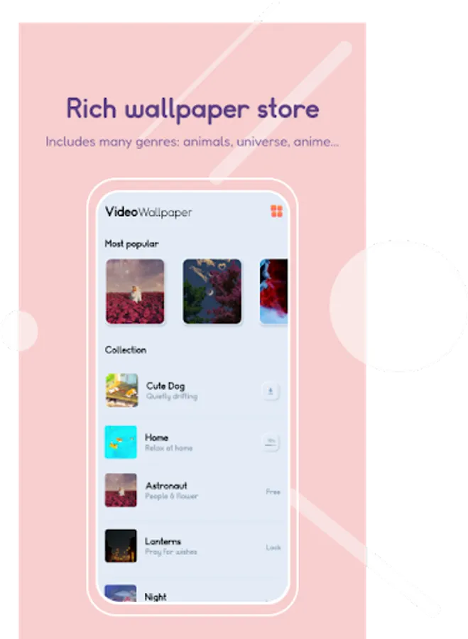 Attractive wallpaper store with all genres: cute, anime, planet, astronaut, space, sky ... Your home screen and lock screen will be more vivid and beautiful when set up animated wallpaper videos.