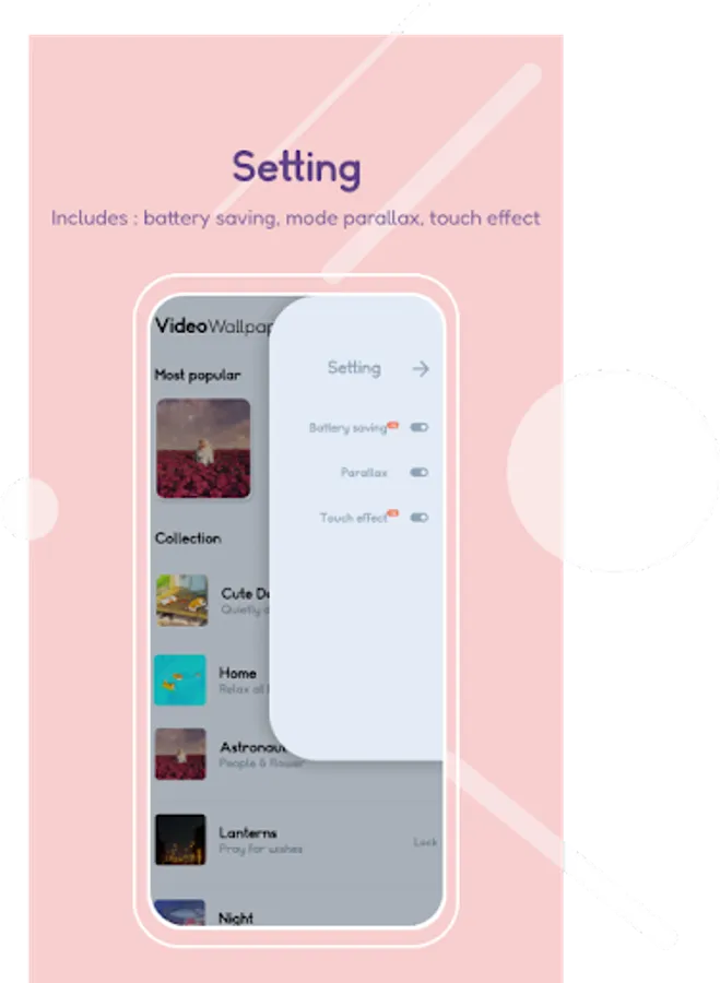 - Set battery saving mode: Video Wallpaper only plays when receiving long-touch gestures on the screen and stops playing when not touching the screen.