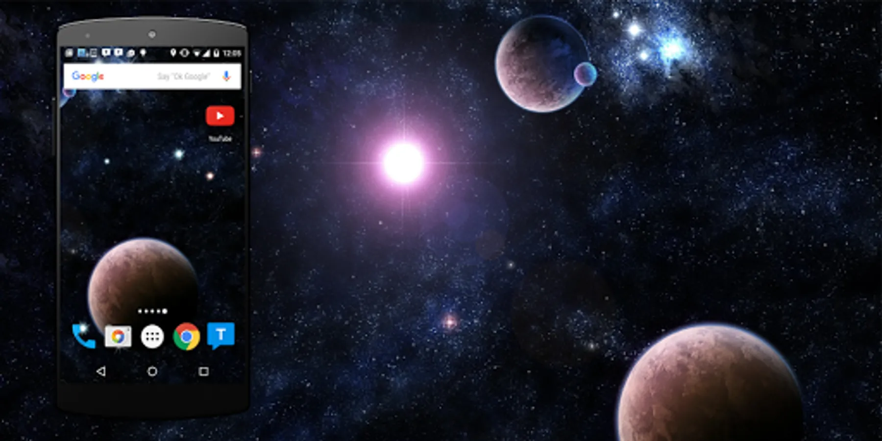 Prepare for the most extravagant and futuristic voyage to the Universe! Planets Live Wallpaper is a next-level application which reveals the secrets of vast space! Mystify your Android ™ phone with fantastic HD wallpapers depicting solar planets all over cosmos! Satisfy your curiosity with our cool backgrounds! There is no need for passing enormous distances in a space shuttle in order to admire galactic wonders! One free download is enough to make the screen of your galaxy phone a window to ''outer space''!
