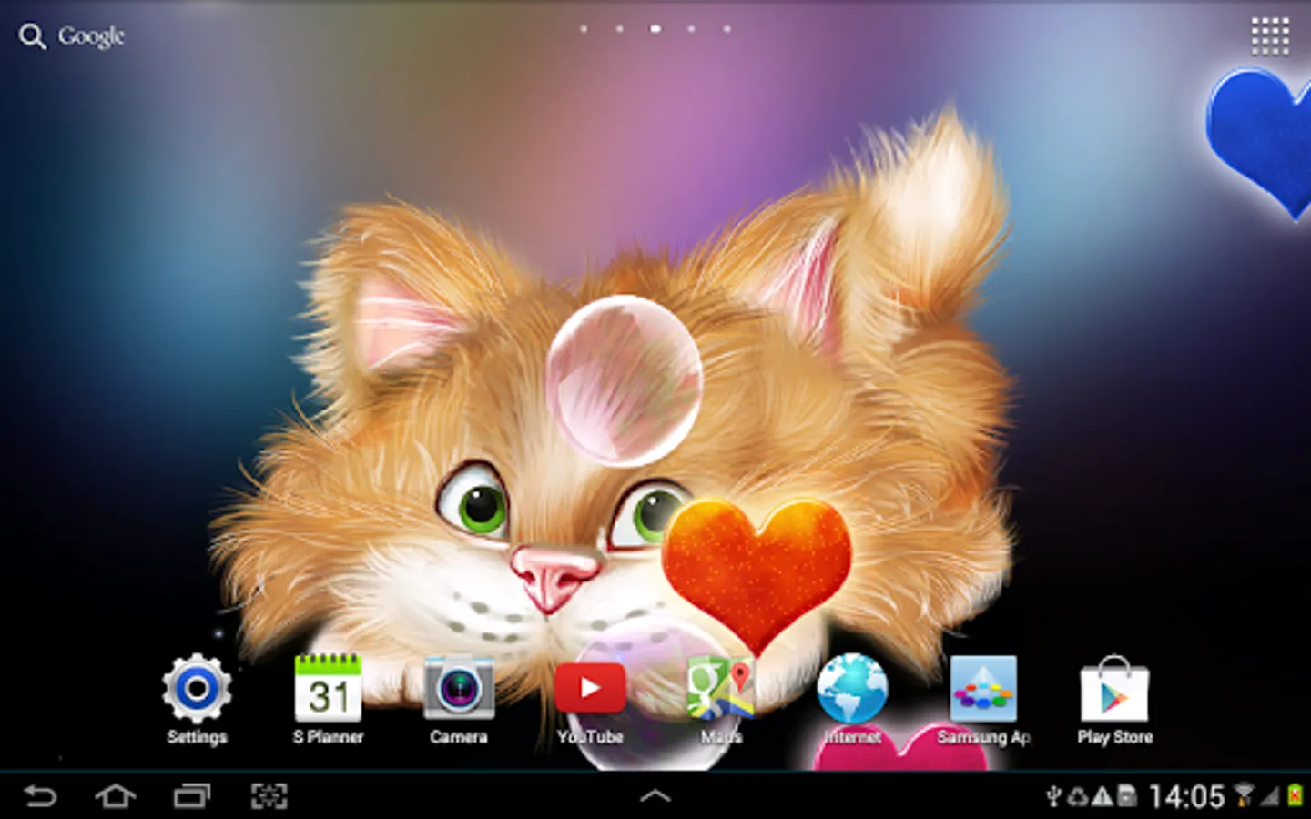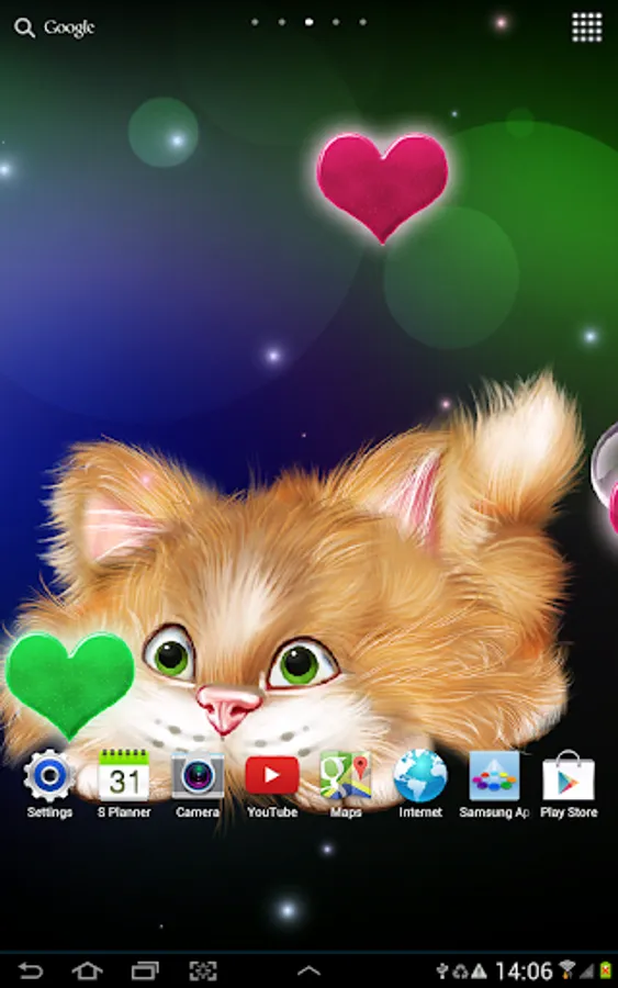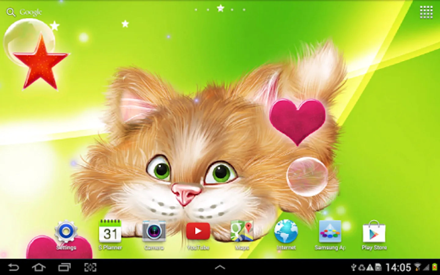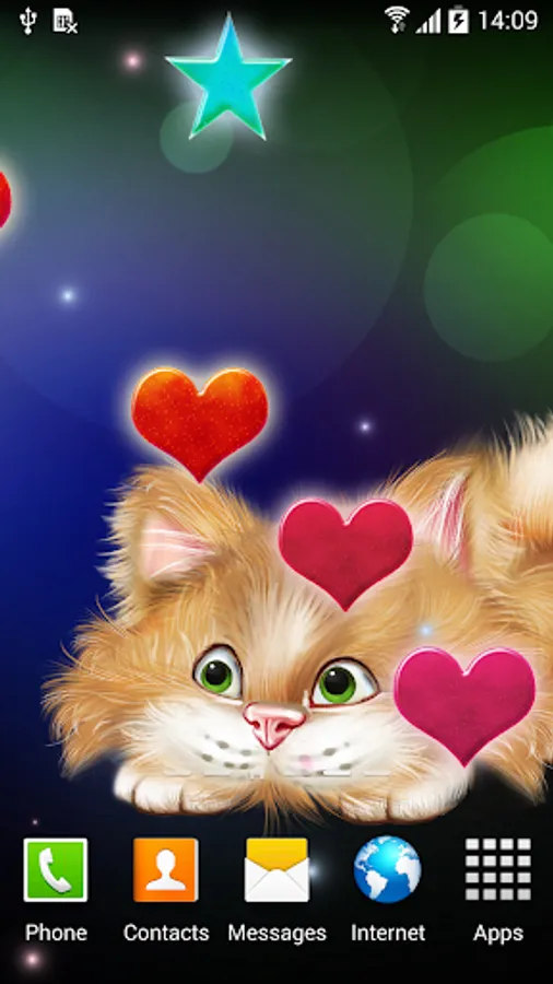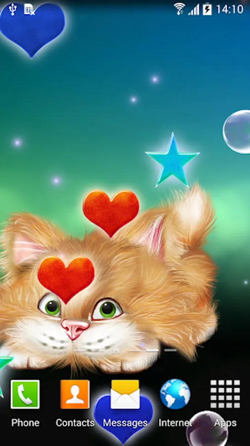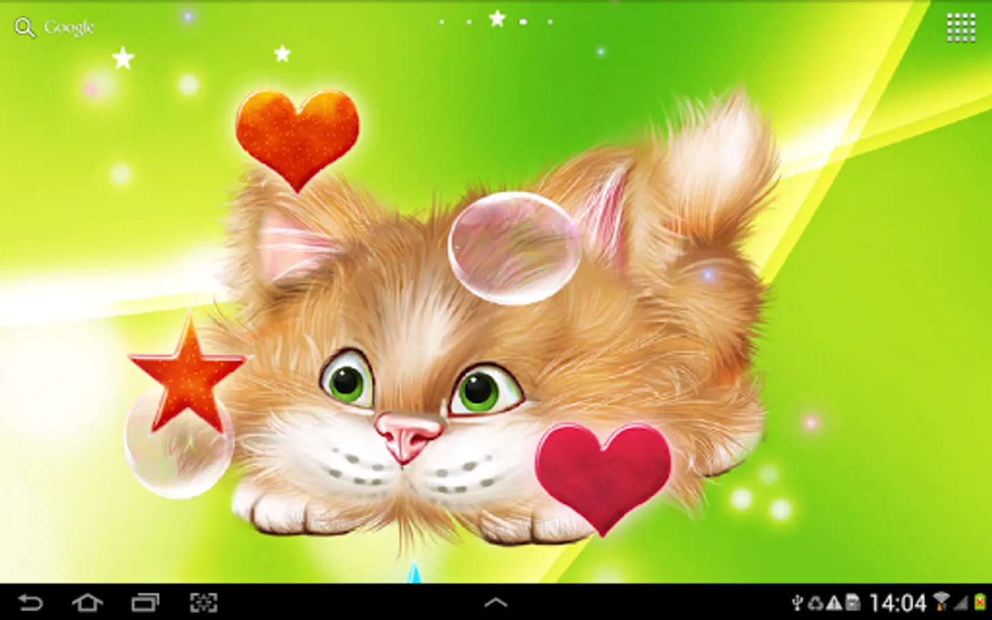 Funny Cat Live Wallpaper - beautiful free live wallpaper with a pretty cute animated kitten. With animated flying hearts and stars that respond to touch, soap bubbles that can be burst by touch, set of abstract backgrounds, animated fireflies, lights and much more.